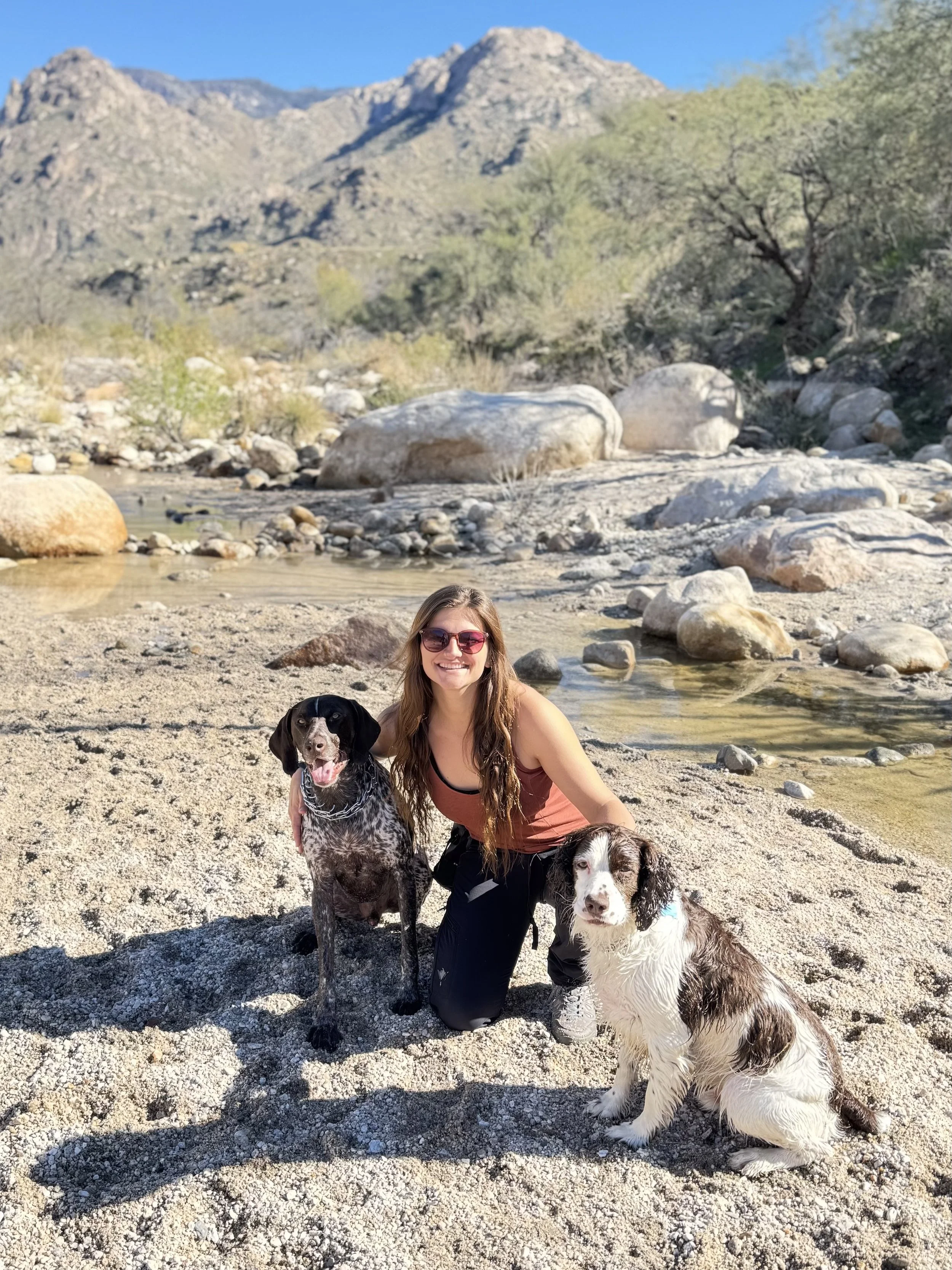 When I’m not working, I love living in the Sonoran Desert (although I certainly miss living near the beach in Charleston). Tucson is artsy, outdoorsy, and surrounded by mountains - so most weekends you’ll find me out rock climbing, hiking/exploring the desert, swimming in natural monsoon-fed pools, caring for my rescued pet snake, or decorating my home with western-inspired art. My boyfriend, Lance, and his two dogs moved in last January, and we spend a lot of time adventuring with them. Fin, an English Springer Spaniel, and Vulture (yes, that name was my boyfriend’s idea!), a German Shorthaired Pointer, are rescued, very energetic, adventurous three-year-olds with impeccable snuggling skills who have become my very best friends. I also turned 30 in 2025 - a milestone that marks a meaningful new decade rooted in work I love and a life I’ve built in the desert.